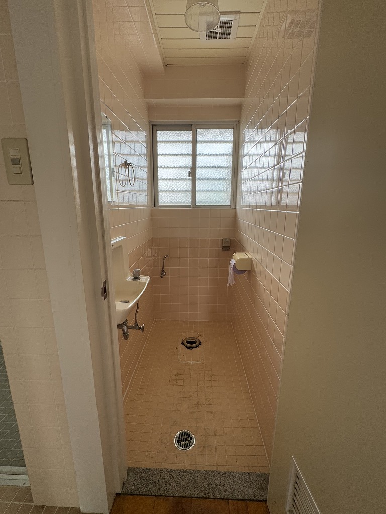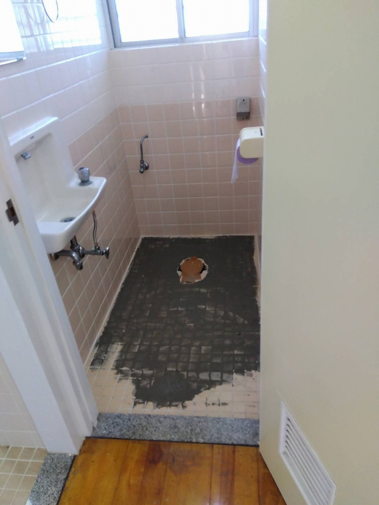 アパートの一室の改修工事例【宜野湾市】トイレの便器取替えと床のフロアタイル張り便器はLIXL アメージュ 温便座床は サンゲツのグレー系既存の便器を撤去してから床のフロアタイル張り、その後新しい便器を取付ます。トイレの他浴室の床防滑シート張り壁のクロス張替え・ペンキ塗り等