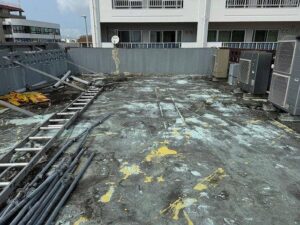 屋上防水工事事例雨漏りで困っているとのこと荷物の移動からスタート水洗い後、人力では左官が難しくなったので道路使用許可を申請してから生コン車等手配しました。その後防水の工程へプルーフロン(クロス入り)トップコートは遮熱